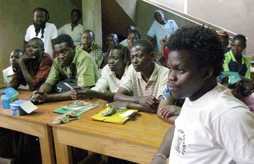 Neb Naba (upper left) teaches new initiates at the Ouagadougou Kebtah temple while training his son and heir, Naba Iritah (lower right) who sits at the front of the class as a teacher's assistant.